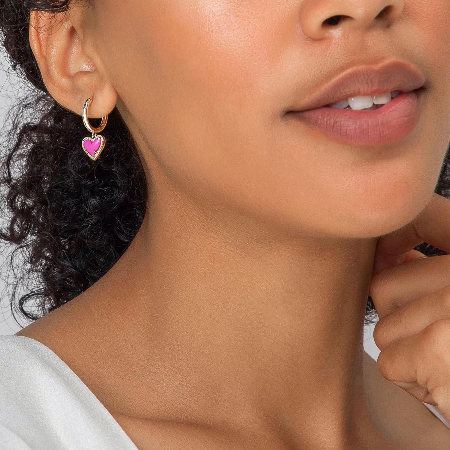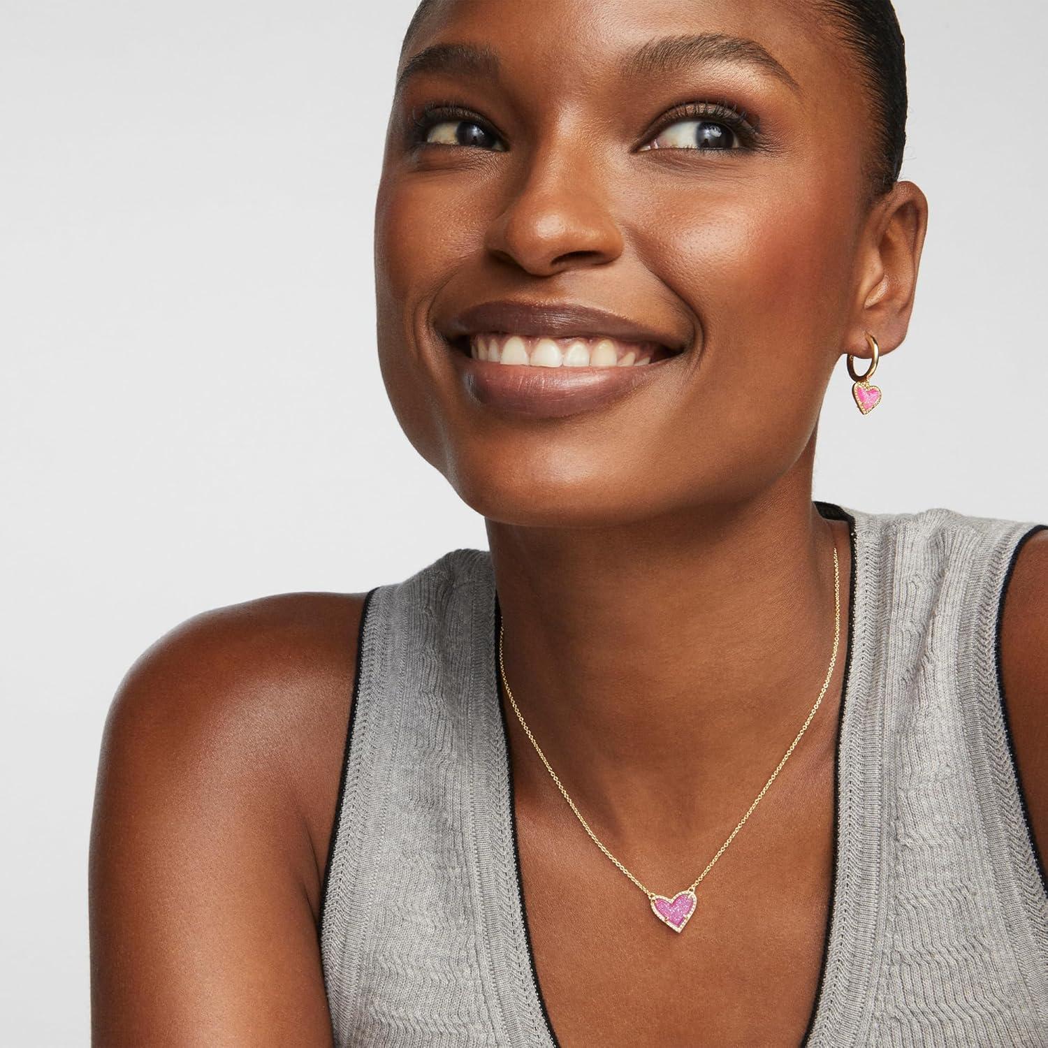 Kendra Scott Ari Heart Huggie Earrings for Women, Fashion Jewelry(GOLD – HOT PINK DRUSY)